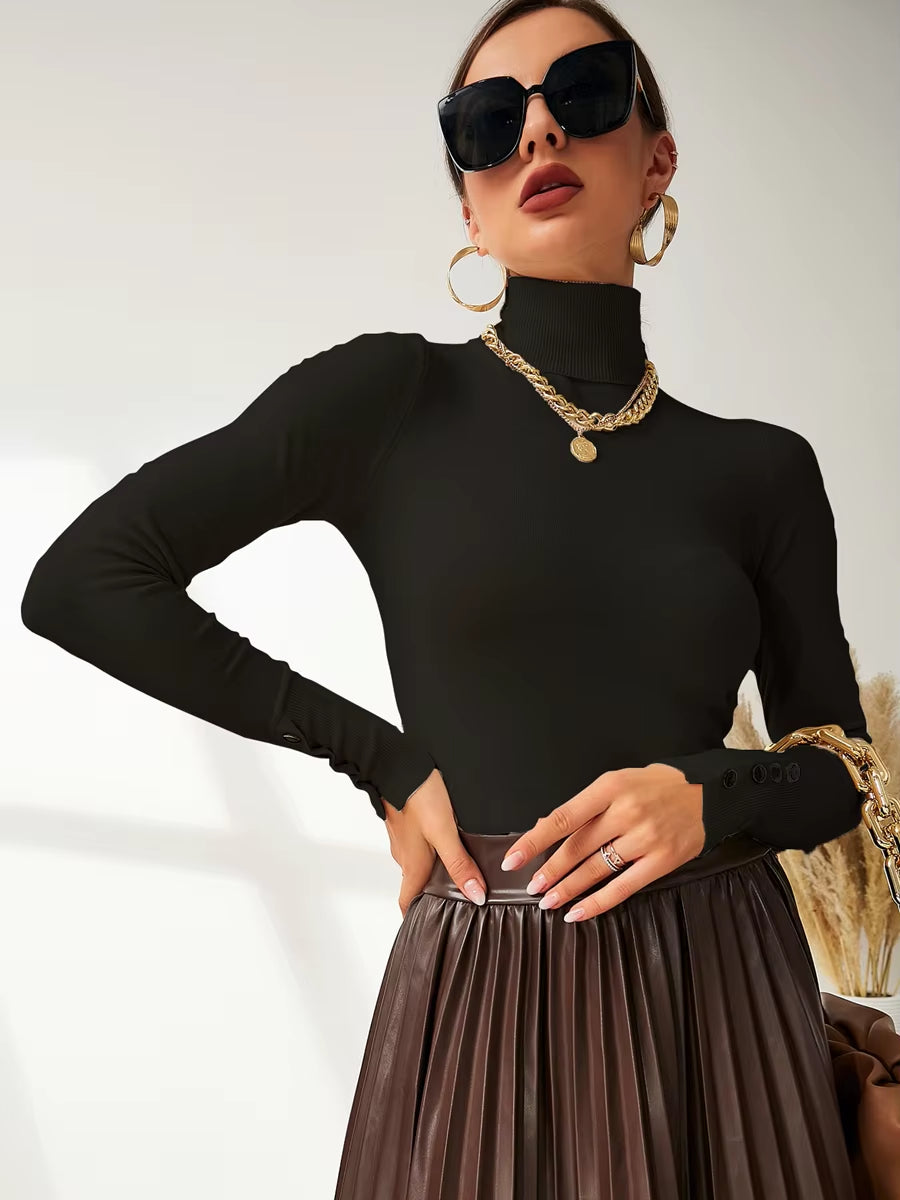 Women's Button Cuff Soft Knit Roll Neck Pullover -